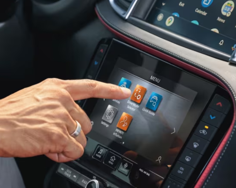 The interior of the 2024 QX55 boasts a dual-screen infotainment setup. The top display is dedicated to navigation, allowing for precise and easy guidance while on the road. The lower touchscreen, on the other hand, handles all radio, media, and vehicle settings, giving you seamless control over your entertainment and vehicle preferences. It’s worth noting that while the top screen has a slightly lower resolution and can only be controlled by the console dial, the QX55 fully supports Apple CarPlay and Android Auto, ensuring compatibility with a wide range of smartphones.